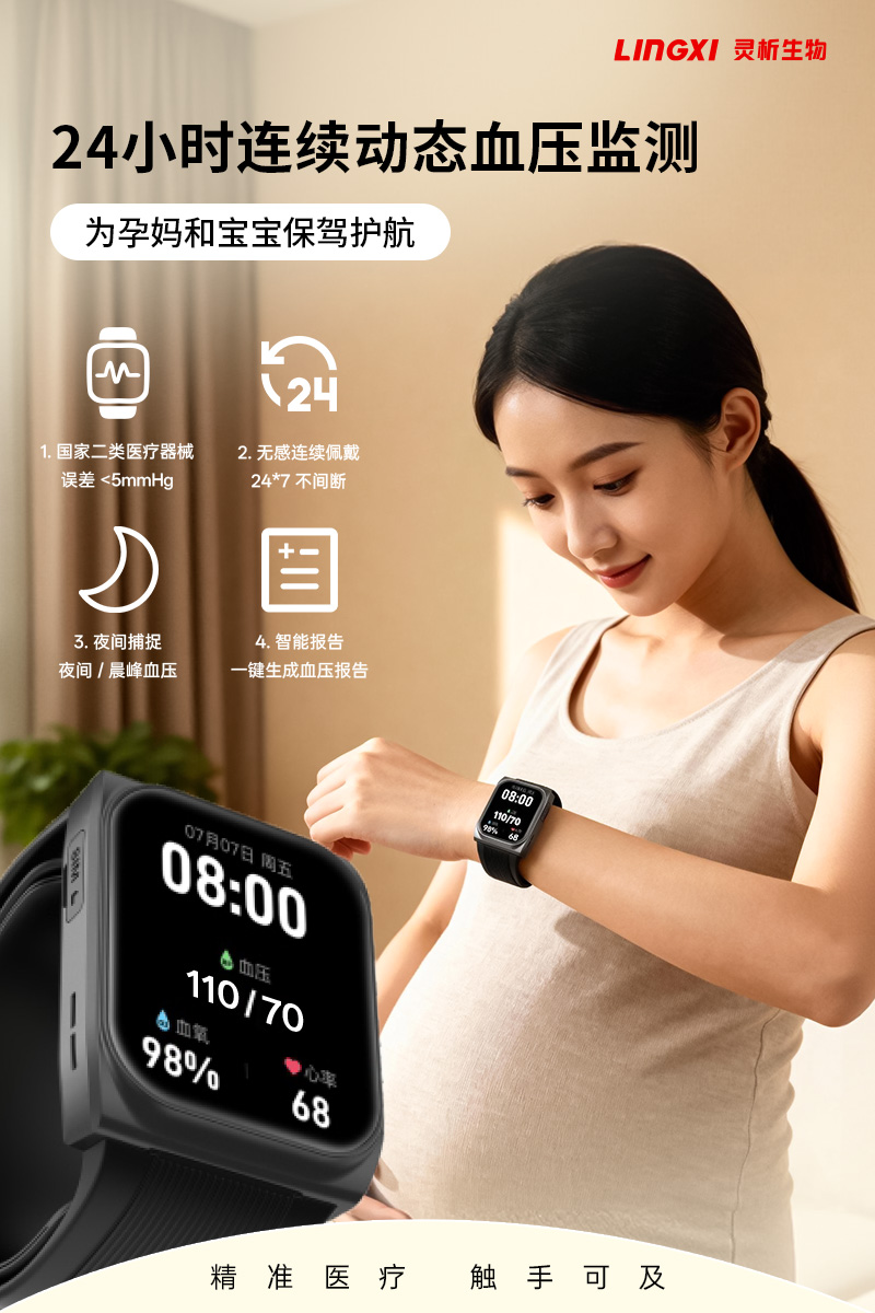 近日,由灵析生物与清华大学微电子学研究所、心永科技联合研发的“灵希连续动态血压手表”率先打破技术僵局,成为国内首款实现无袖带、连续动态血压监测的医疗级智能手表。这款产品通过“PPG+压力”融合传感技术,攻克了传统设备在精度、舒适度与连续性上的行业痛点,不仅获得国家二类医疗器械认证,更标志着中国在动态血压监测领域实现了从跟跑到领跑的关键跨越。